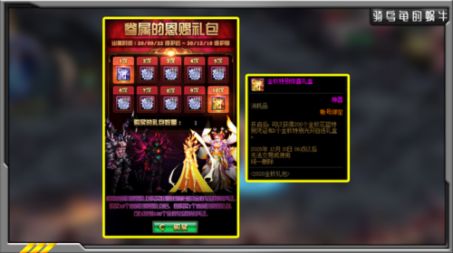 购买首套礼包可以获得惊喜礼盒,固定获得金秋花篮特别凭证100个,金秋礼包7折优惠券,并且还可以自选一个黄金品级调整箱或者是+11强化券或+10增幅券。