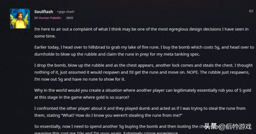这名玩家叫Soulflash,他讲述了自己拿“火焰之湖符文”的经历。这是术士非常重要的一个符文,效果是增强火雨,让术士和宠物一段时间内火焰40%增伤。做这个任务,首先要在希尔斯布莱德丘陵的地精商人吉克希尔处购买一个爆破炸药,售价高达5G,这在25级封顶的P1算一笔巨款。然后拿了这个道具前往敦霍尔德城堡(部落救兽人的地方),用这个炸药来炸毁一些碎石,接着装有符文的箱子现身,有齿轮标志可互动。但此任务很扯的第一点,是除了开任务的术士,其他人也能点箱子,而这边来来往往的人还不少。