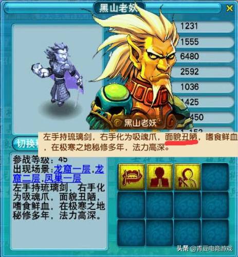 黑山老妖看上去很威武,可是模型做的面目全非,我们可以看到官方给出的黑山老妖介绍中说道:面貌丑陋,嗜食人血。反正第一眼看到这个家伙就很可怕,不信你们仔细看黑山老妖模型的脸。
