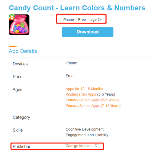 但以《数糖果》这款游戏为例,在上述名为Educational App Store(教育应用软件商店)的英文网站中,记者发现其发行商则显示为卡迷果的全资控股公司。
